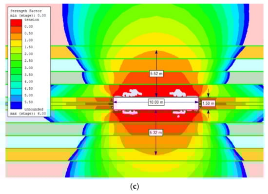 The extent of the rock destruction zone around the gasification channel with a width of 10 m and the impact of temperature of 1200 °C for the dry rock mass, up to the height of: (a) 0.5 m; (b) 1.0 m; (c) 1.5 m.