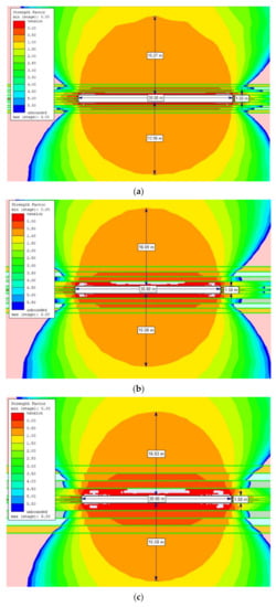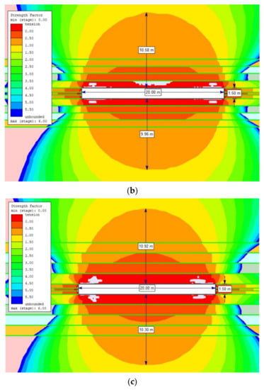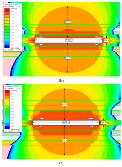 The extent of the rock destruction zone around the gasification channel with a width of 20 m and the impact of temperature of 1200 °C for the dry rock mass, up to the height of: (a) 0.5 m; (b) 1.0 m; (c) 1.5 m.
