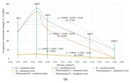 - For dry sandstone heated at 300 °C and 600 °C, the compressive strength increases by 80.7% and 36.6%, respectively, while for temperatures from 900 °C to 1200 °C, there is a decrease by 30.06% and 65.68%, respectively, in relation to the temperature of 20 °C. In the case of wet sandstone, there is an increase of 72.8% and 7.7% for temperatures of 300 °C and 600 °C, respectively, and a decrease of 60.73% and 95.73%, respectively, for temperatures of 900 °C and 1200 °C. The tensile strength for dry sandstone increases by 24.06% and 10.06%, respectively, for the temperatures of 300 °C and 600 °C, and decreases by 30.06% and 65.68%, respectively, for the temperatures of 900 °C and 1200 °C. On the other hand, for wet sandstone, there is an increase of 19.63% for the temperature of 300 °C and a decrease of 5.37%, 72.86% and 87.29% for the temperatures of 600 °C, 900 °C and 1200 °C, respectively;