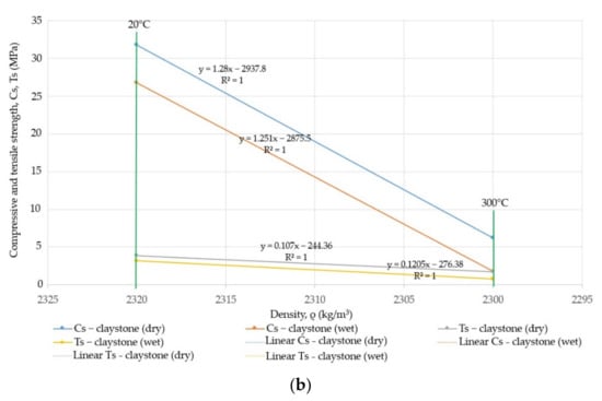- For dry claystone at the temperature of 300 °C, the compressive strength and tensile strength decrease by 80.5% and 55.15%, respectively, while for wet claystone, these decrease by 93.35% and 75.78%, respectively, in relation to the initial value. After exceeding the temperature of 300 °C, the claystone decomposed;