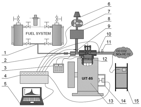 Test bench. 1—Refueling system; 2—Injector; 3—Electronic engine control system; 4,5—Data acquisition system with computer system; 6—Air filter; 7—Air flowmeter; 8—Surge tank of 120 dm3 for suppressing pressure oscillations; 9—Air–fuel mixer; 10—Temperature sensor for exhaust gases; 11—Universal exhaust gas oxygen (UEGO) sensor; 12—Spark plug combined with a pressure sensor; 13—UIT-85 research engine; 14—Encoder; 15—Exhaust gas analyzing system.