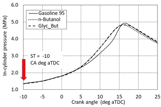 In-cylinder pressure traces vs. crank angle for the tested fuels at fixed spark timing of −10 CA deg aTDC.