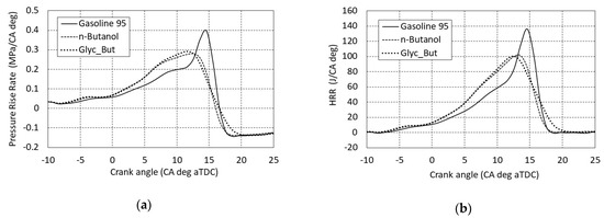 To investigate more deeply the combustion dynamics, the following quantities were introduced: pressure rise rate, heat release rate, and combustion phases. Figure 3a illustrates pressure rise rate determined as derivative dp/dCA taken from in-cylinder pressure p over the crank angle CA. To provide the same initial conditions for combustion mainly concerning pressure and temperature at the ignition, the spark timing was fixed at −10 CA deg aTDC for these three tested fuels. As depicted, both the n-butanol and the Glyc_But combustion events are characterized with the lower peak of dp/dCA in comparison to the gasoline combustion events. What is more interesting, the addition of glycerol at the amount of 25% to n-butanol does not significantly influence the pressure rise rate and the heat release rate (HRR) (Figure 3b) when compared to the n-butanol test.