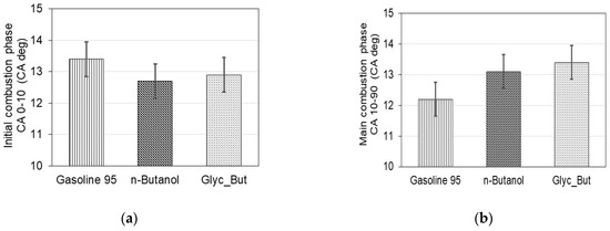 Based on equations for HRR and its integral denoted as the cumulative heat released, the combustion phases CA0-10 and CA10-90 were determined. As seen in Figure 4a, the longest CA0-10 of 13.3 CA deg is for the gasoline combustion test; the shortest is for n-butanol and equals 12.8 CA deg. Hence, the difference between the shortest and the longest duration of this first CA0-10 phase is not crucial as regards the combustion process at all. The same conclusion can be drawn from Figure 4b, presenting CA10-90. The entire combustion duration expressed as the phase CA0-90 is 25.6, 25.8, and 26.3 CA deg for gasoline, n-butanol, and Glyc_But, respectively. The relative difference is 2.7% between gasoline and Glyc_But CA0-90 and this is similar to the uncertainty (0.55 CA deg) for the combustion phases. Hence, one can conclude that gasoline and Glyc_But do not differ from each other regarding combustion duration.