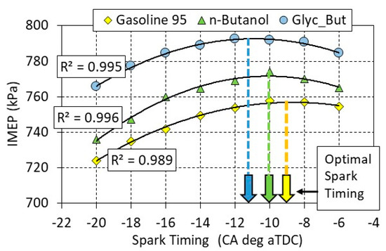Butanol and gasoline were used as reference fuels to provide comparative analysis and show differences and common features between these fuels and Glyc_But. At first, the investigation was focused on determining the optimal spark timing to obtain the maximum indicated mean effective pressure (IMEP). Next, progress in combustion expressed by combustion phases was under research. To provide the same initial conditions for the start of combustion, the spark timing was fixed for these tests. Finally, exhaust emissions tests were conducted under maximum engine load (maximum IMEP). A detailed description is presented in the section Test Matrix.