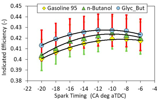As can be seen, the optimal spark timings are −9, −10, and −11 CA deg aTDC and they correspond to IMEPs of 759, 773, and 792 for gasoline 95, n-butanol, and Glyc_But, respectively. A graphical representation of maximum IMEP is shown in Figure 6a. As depicted, IMEP is charged with the uncertainty of 18 kPa, which corresponds to 2.2%. The difference in IMEP for gasoline and Glyc_But is 33 kPa, which stands for 4.3% concerning the IMEP from the gasoline test. This is in the uncertainty limits for IMEP equalling ±2.2%. Taking into account the uncertainty in the fuel flow rate of 1%, one can state that the slight increase in IMEP when replacing gasoline with Glyc_But is confirmed.