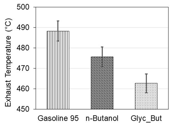 As can be concluded from Figure 7, this efficiency for n-butanol and Glyc_But tests does not deteriorate, and it can even be said that it improves slightly in comparison to the gasoline test. However, one may find that this improvement is questionable because it is within the uncertainty for the indicated efficiency. However, this efficiency improvement can be reasonably explained. During tests, exhaust gas temperature was measured. The exhaust temperature sensor was installed in the tailpipe, approximately 0.5 m away from the engine exhaust valve. Hence, this temperature cannot be considered as the post-flame temperature due to a cooling effect in the tailpipe, but can provide a valuable conclusion. As depicted in Figure 8, the exhaust temperature is the lowest for the engine fueled with the Glyc_But fuel. The decrease is approximately 26 °C. In the Kelvin scale, this temperature drop is approximately 3.4%. Thus, the heat loss in the exhaust gases can decrease in the same ratio, which affects increases in both IMEP and indicated efficiency.