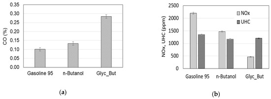 As depicted in Figure 9a, CO emission was remarkably increased when changing the fuel from either butanol or gasoline to the Glyc_But blend. Relatively short combustion duration, as is typical for IC engines, provides favorable circumstances for increases in CO emissions. Particularly, the high CO emission appears for air–fuel mixtures under a stoichiometric ratio. Hence, the time for the combustion process inside the engine cylinder is not sufficient enough to oxidize CO into CO2, even though the engine worked at a low speed of 600 rpm. This increase in CO emission is almost two times higher. This was probably caused by the lower combustion temperature, which was indicated by the lower exhaust temperature (Figure 8) in the test with Glyc_But fuel, and it promotes higher emissions of CO. As is well-known, temperature strongly affects chemical reaction rates. Hence, the drop in the exhaust temperature resulting from the in-cylinder combustion temperature affects combustion progress as well as reaction rates for the exhaust toxic compounds NOx, CO, and UHC. UHC (unburnt hydrocarbons) did not increase significantly (Figure 9b) as the CO increased, but UHC emission inversely depends on oxygen bonded in the fuel.