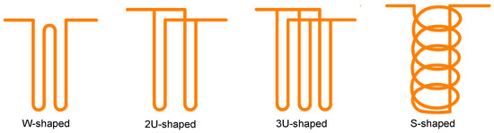 The principle for designing a tube shape is to maximize the area of heat transfer. As shown in Figure 2, the tube shapes include U-shaped, 2U-shaped, 3U-shaped, W-shaped, and S-shaped (spiral-shaped). Their heat performances are illustrated in Table 1. The S-shaped tube has the best heat transfer efficiency because it has the largest heat transfer area [13], shown in Table 1. Furthermore, the selection of tube shapes needs to consider the heat exchange rate, cost, and other factors such as the number of piles, the length of the drilling holes, and the difficulty of construction.