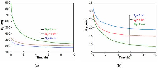 Changes of heat exchange rate and relative heat exchange rate with time for different spiral pitches (), (a) heat exchange rate , (b) relative heat exchange rate .