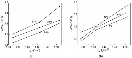 Gases exist in the pores mainly in a free state, while a small part of gases are adsorbed/dissolved on the surface of soil particles. Factors such as shape, structure, and arrangement of soil particles determine the porosity, size, and distribution of soil pores, affecting the thermal conductivity [33,34]. As shown in Figure 4, there is a positive correlation between dry density and thermal conductivity of the soils because the contact area of soil particles increases with the increase of dry density, and the thermal conductivity of mixed soils is closer to the particles [35,36]. The microstructure of soils will also have an influence on the thermal conductivity, and perfect grading has greater thermal conductivity [33,37]. Additionally, previous works showed that the disturbance of the soils have little influence on the thermal conductivity, therefore field tests can be used instead of indoor ones [38].