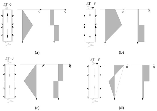 Different from conventional pile foundations, energy piles bear additional temperature loads induced by the continuous heat exchange. The heat transfer changes the temperature distribution, leading to the expansion/contraction of energy piles. Due to the geotechnical constraints, the piles are not free to deform, leading to additional temperature stresses on the piles. Energy piles are commonly frictional piles that are subject to lateral frictional resistance and tip resistance balanced with external forces. To simplify the model, an energy pile is usually assumed to be a rod that deforms thermally [54]. As shown in Figure 5, energy piles are subjected to thermal and mechanical stresses simultaneously. The pile stress is closely related to the temperature. For column piles, the stresses and displacements under temperature loading exhibit thermos-elasticity, indicating that temperature has little effect on mechanical properties [55,56,57].