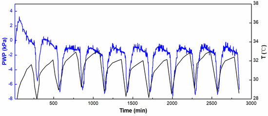 The thermal properties of the soils around energy piles are changed during the heat transfer process [71,72,73]. By conducting model tests on saturated, normally consolidated clay, Yazdani studied the pore water pressure (PWP) and ultimate bearing capacity of an energy pile under cyclic temperature [74]. The temperature and PWP changed periodically, and the periods were basically the same (Figure 7). The change of pore water pressure is mainly determined by the rate of heating and cooling, permeability, and compressibility of clay [75]. Except for the initial stage, the PWP is basically at a negative value because under the action of the temperature gradient, directional migration of water generates the suction between the soil particles and the pore water. The suction reduces average pore pressure to increase soil skeleton stress and binds the particle surface.