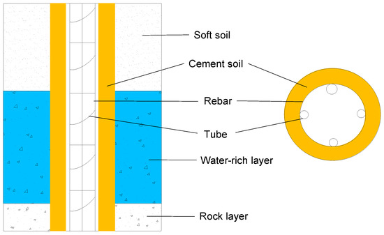 As illustrated in Figure 9, a reinforced concrete core pile encased in cement soil extends to the water-rich layer. With the mixing and rotary spraying equipment, prefabricated cement slurry is injected to first form cement soil. The prefabricated energy piles of reinforced concrete are then placed into the hole and filled with cement paste by lifting equipment. The foundation formed by cement soil and core energy piles will synergistically cause deformation [94].
