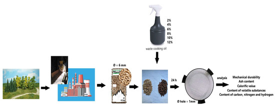 Each batch of the pellets (of different type and origin) was divided into seven samples and placed into separate containers. Subsequently, waste sunflower cooking oil was added, by spraying, at the rates of 2%, 4%, 6%, 8%, 10% and 12% relative to the weight of the pellets. The control sample comprised pellets without a modifier added. The samples prepared this way were left for 24 h so that the oil could be absorbed by the pellets. Finally, the samples were put through a sieve with 1 mm openings, in order to remove any potential contamination and excess oil. Figure 2 shows the scheme of the experiment.