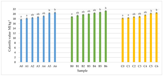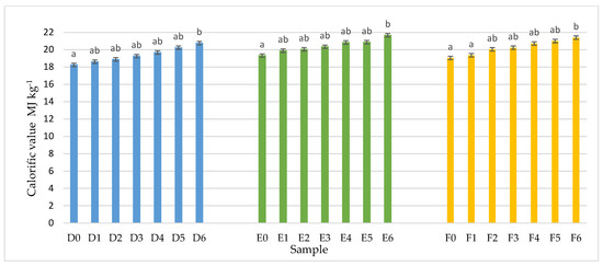 Calorific value of samples of coniferous and coniferous–deciduous wood pellets before and after waste cooking oil was added by spraying. Statistically significant differences marked by different letters (p ≤ 0.05). Differences between average values marked with the same letters (a,b) are not statistically significant at the level of p ≤ 0.05 according to the Duncan test. The data were analysed separately for each type of pellet.