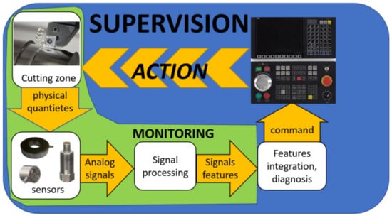 The general structure of a tool and cutting process diagnostic system is shown in Figure 1. A number of physical quantities are present in the cutting zone, some of which are correlated with the tool condition. Appropriate sensors convert these quantities into electrical signals, which are subjected to more or less complex processing, starting from filtering, through conversion into digital form, to the determination of SFs useful for diagnostics. Based on the selected SFs, a diagnosis of the tool condition is generated, which can be transmitted to the machine tool control system, which takes appropriate action. Monitoring can be a part of the described structure, from the measurement of physical quantities to the determination of SFs, which can, for example, be displayed as information for the operator. If the tool condition is determined on the basis of the calculated SFs, monitoring becomes diagnostics. On the basis of this tool condition, a command can be worked out, which is automatically transferred to the machine tool control system. Then we are dealing with supervising.