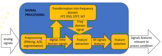 It is generally acknowledged that reliable process condition monitoring based on a single Signal Feature (SF) is not feasible. Therefore, the calculation of a sufficient number of SFs related to the tool and/or process conditions [20] is a key issue in machining monitoring systems. This is obtained through signal processing methods that comprise the stages shown in Figure 2.