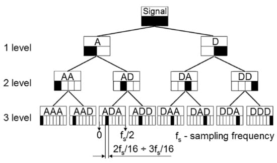 To determine SFs in the time–frequency domain, it was decided to apply the WP3 three-level packet wavelet transform using the db02 wavelet. As a result of the transform, 14 packets (band signals) were obtained. According to the scheme presented in Figure 3, if etc. the raw signal contains information about frequencies 0–1000 Hz, two band signals are obtained as a result of the decomposition at the first level: Approximation A (containing information about frequencies 0–500 Hz) and Detail D (containing information about frequencies 500–1000 Hz). At the second level, we obtain four band signals, with a frequency bandwidth of 250 Hz and at the third level, we obtain eight band signals with a frequency bandwidth of 125 Hz. Thus, for each of the diagnostic signals we receive a total of 14 band signals in addition to the raw signal.