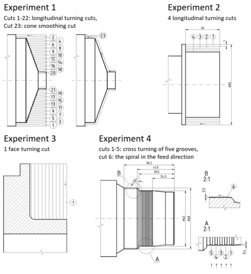 It was decided to analyze the usefulness of signal features for tool condition diagnostics during turning using experiments representing the widest possible variety of machining variations and conditions. The description of the experiments is presented in Table 1 and Figure 4.