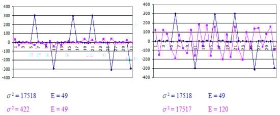 Energy entropy deserves special attention here, which, in contrast to variance (or its derivatives, such as standard deviation), is a feature of dispersion that is not very sensitive to individual disturbances. Figure 5 shows a simulation of different signals and the Energy entropy values and variances of these signals. The first graph shows two waveforms—purple and dark blue. The order of magnitude of both signals is similar, but the dark blue waveform contains single pulses. Below the chart, the values of variance are presented (σ 2) and Entropy energy features (E) for both runs. The results show a strong variance response to single signal perturbations, while the energy value remains unchanged. In graph two, the purple waveform has values an order of magnitude higher than in graph one, while the values of the dark blue waveform remain unchanged. The variance value, in this case, showed no difference, while the Energy entropy shows a difference between the two. The difference is due to the logarithm function, which highlights changes by an order of magnitude. In Figure 5 the signal samples in both runs, apart from a few disturbances, have a similar order of magnitude hence the Energy entropy value is similar. In comparison, the variance shows high sensitivity to single perturbations which translates into a significant value of this feature. In Figure 5, both presented signals significantly differ as for the order of magnitude of signal samples, which immediately influences the value of entropy energy. The variance, in this case, shows no difference between signals of such different nature.