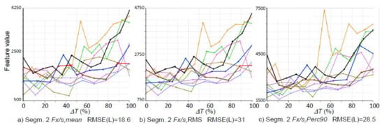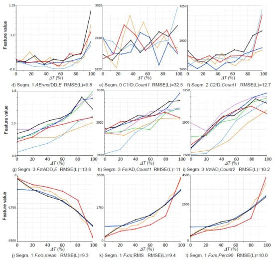 In Figure 7, example courses of SFs for individual experiments are presented. The curves are presented as a function of the used part of the tool life (ΔT [%]) for successive shelf-lives—each marked with a different color. The name of the feature, the value of RMSE(L) and the number of the segment for which the feature was determined are shown above each course of the feature.