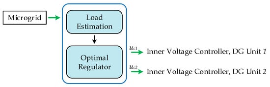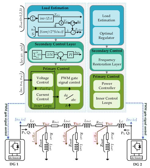 This section describes the operation principle of the proposed methodology and details the associated MG setup employed in this research. For simulation studies, a radial type of feeder is used as shown in Figure 2, where two DG units are interfaced using three phase, three-wire power electronics inverters, feeding three load buses Vbus1, Vbus2, and Vbus3 through feeder impedances with connected loads, i.e., Zload1, Zload2, and Zload3. The working principle of load estimation and an optimal regulator is discussed in Section 3.1 and Section 3.2, respectively. System control parameters for the stability analysis, simulation, and experiment are given in Table 1 and Table 2.