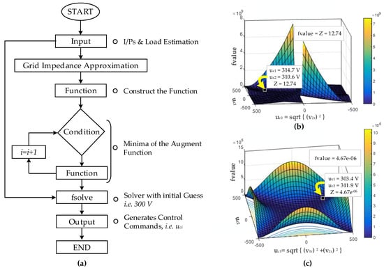 The minima of the augmented function ∧ (v1r, v1q, v2r, λ) are located where all of the partial derivatives, i.e., (∂∧/∂v1r = 0, ∂∧/∂v1q = 0, ∂∧/∂v2r = 0 and ∂∧/∂λ = 0) are equal to zero. As the minima “fvalue” of function and control inputs uci, corresponding to different disturbance loads, are illustrated by Figure 4b,c. This algorithm numerically approximates partial derivatives as opposed to analytical evaluation. The important aspect of the numerical derivative strategy is that it can work for multiple variables without even changing the code. Computing the algorithm, the optimal regulator sends the required control commands uci (uc1, uc2) to respective power controllers of the DG units, and the system works the same until the upcoming sampling update. The term uci compensates bus voltage deviation and shares reactive power proportionally. Periodically, the optimal regulator revises its original control plan due to measurements feedback, in line with the latest approximated grid impedance information.