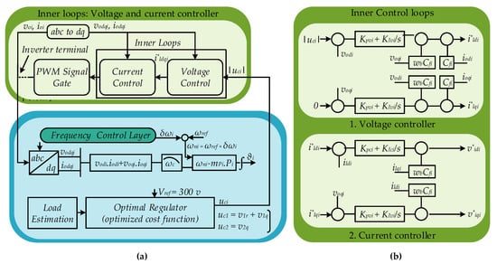 where ωref, and mPi are the nominal frequency and droop coefficients, respectively. The slop of frequency droop characteristic is controlled by mPi parameters. Output frequency of inverter connected with dc power source is adjusted by real power and inner controller. Every ith DG unit is composed in its d-q frame, depending on their angle. By transformation equations, shown in Equation (18), each inverter is transferred to the d-q frame. The proposed power controller is shown in Figure 5a, where the real power and frequency (p-ω) droop layer is responsible for sending the angle to the ith inverter as given by Equation (19).