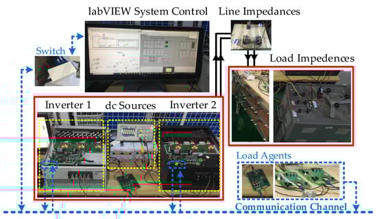 This section details the stability analysis, simulation, and experimental results. The simulations are conducted on MATLAB/Simulink on the circuit configuration shown in Figure 2. Wherein the two paralleled connected DG1 and DG2 units are feeding three load buses. In contrast, the experiments are conducted for three phases, 50 Hz scaled islanded MG prototype as depicted in Figure 6, where the system consists of two identical paralleled DG units with a maximum rating of 3 A, 30 V. Ethernet module USR TCP 232 is used for serial communication transmission of data amongst the data terminal equipment (DTE) and data communication equipment (DCE). The whole platform of islanded MGs is controlled by a desktop LabVIEW control system. The system and controller parameters that have been used for the proposed methodology are given in Table 2.