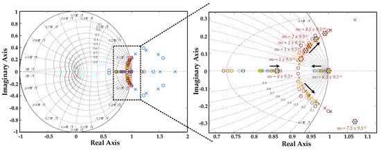 The complete model of the test system under the presented control scheme is used to analyze stability under varying communication latencies and control gains. MATLAB/Simulink and linear analysis tools have been used in order to obtain modeling results by analyzing the complex system through perturbing dynamical equations. Figure 7 shows the stability plot for the proposed control framework by varying real power droop gain mP to trace the network trajectory. The control values of the droop gain mP where system poles appear to be in the vicinity of the unit origin are considered to be maximum allowable limits. Therefore, using the poles-zero evolutions, the control gain sensitivity, and system stability are predicted. The maximum and minimum mP gain values used for the proposed control scheme are 1 × 9.5−09 and 1 × 9.5−05, respectively.