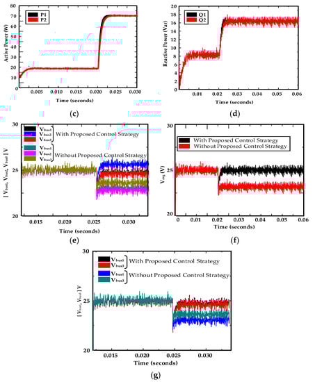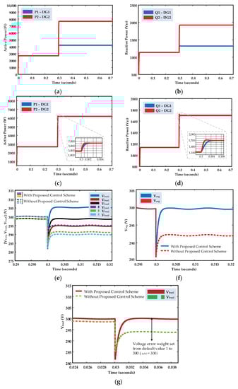 Simulation results. (a) Active power response without proposed control scheme. (b) Reactive power response without proposed control scheme. (c) Proportional active power sharing proposed control scheme. (d) Proportional reactive power sharing with proposed control scheme. (e) Load buses Vbus1, Vbus2 and Vbus3 response curve. (f) Average load bus voltage curve of Vbus1, Vbus2 and Vbus3 (g) Vbus1 and Vbus3 voltage curve by weight (ωb1, ωb2) variation from 1 to 300.