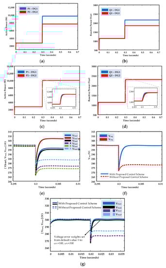 To further investigate the superior control performance of the proposed optimal control strategy two disturbance loads (Ld1 = 69 mH, Rd1 = 9.9 ohm, Ld3 = 69 mH and Rd3 = 9.9 ohm) are exerted at bus 1 and bus 3, simultaneously. It is observed that the disturbance leads to a heavy power-sharing error and respective bus voltage drop, shown in Figure 10. Active and reactive power response with conventional control scheme is demonstrated by Figure 10a,b. Such power-sharing errors are eliminated and compensated to almost zero, once the proposed methodology is activated at time 0.3 s, illustrated in Figure 10c,d. Three load buses voltage response and average voltage response with and without presented control schemes are depicted in Figure 10e,f, respectively. Figure 10e shows the average of 5 V volts deviation at bus1 and bus 3, and even the control strategy was activated. This deviation is improved and restored to a nominal voltage by varying both buses voltage error weights, set from default value 1 to 300 (ωb1 = 300 and ωb3 = 300) as demonstrated in Figure 10g.
