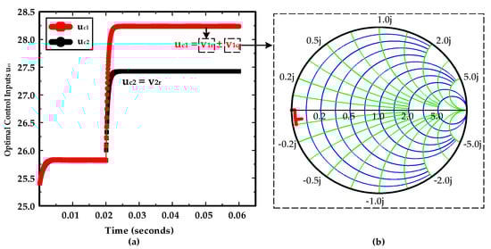 An optimal control inputs (uci) to lab-scaled distributed generation units (a) Variation of uci (uc1, uc2) under disturbance load at 0.02 s. (b) An imaginary part (v1q) of uc1 curve, in red, on smith chart.
