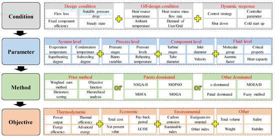 - For optimization parameter, the researches are mainly carried out from four levels: system, process, component and fluid. However, the existing researches are relatively independent. A comprehensive design method that couples multiple levels simultaneously is expected to improve the system performance further.