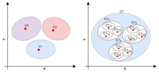 Since ARM analysis can only handle categorical data, clustering analysis is required in advance to group or cluster the dataset. Clustering analysis is the task to grouping the data into meaningful groups, so that the data in the same cluster are highly similar, and the data in different clusters are very distinct [6,22]. Cluster analysis has been applied to a variety field such as marketing, crime prevention, educational sector, medicine, and biology [22]. A multi-layer k-means algorithm was selected to perform the clustering analysis [33]. The multi-layer k-means algorithm result is better than a traditional k-means algorithm. The K-means algorithm is a popular clustering method, simple to implement, knows limitations, and has excellent fine-tuning capabilities. However, it is vulnerable to outliers and noise data which can reduce the clustering analysis accuracy [34]. Therefore, the multi-layer k-means algorithm has been applied to solve these problems. Figure 4 describes the multi-layers k-means algorithm. The left side shows that the data is clustered into three (k = 3), C1, C2, and C3. Since multi-layer k-means is applied, each cluster needs to be further clustered into several small clusters (sub-clusters). The right side takes C1 samples which are clustered into sub-clusters and further clustered into sub-sub-clusters. Equation (10) explains the k-means clustering algorithm objective. Where, k, n, x i , c j are the number of clusters, number of cases, case i, and centroid for cluster j. The silhouette method was used to determine the number of clusters (k) in the k-means algorithm as formulated in Equation (11), where d o u t x indicates the smallest average distance between point x and all points in another cluster, and d i n x indicates the average distance between point x and all other points in the same cluster. The range silhouette score is between −1 to 1. A higher score indicates better clustering performance [35]. The centroid is the mean of a variable for the observations in the cluster.
