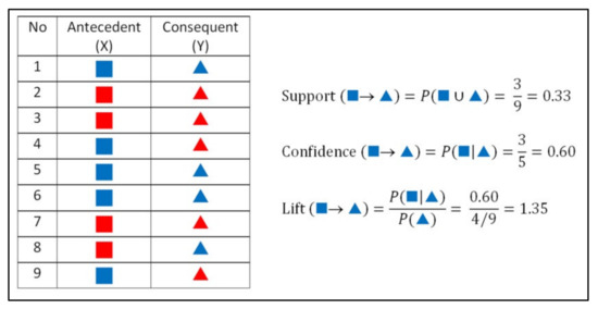 Figure 5 illustrate the description of ARM measures. There is a table that contains examples of X and Y data. The blue squares and blue triangles are assumed as the X and Y values, respectively, and are evaluated using the support, confidence, and lift.