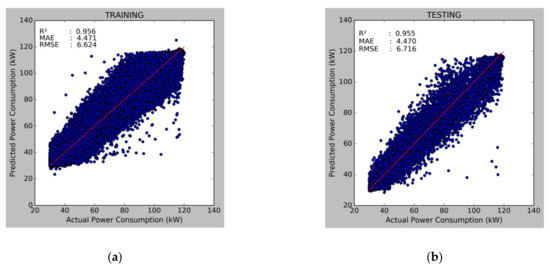 Figure 6. The scatter plots between the actual and predicted power consumption and the model assessment: (a) training, (b) testing.