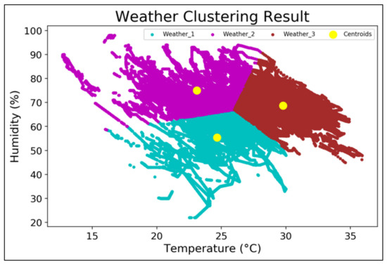 The silhouette method was performed to determine the best number of clusters for weather data. Based on the silhouette method, the best number of clusters for the weather data is three. The weather data used are outdoor air temperature and humidity. The clustering analysis is performed using k-means algorithm from scikit-learn library. The parameters need to set before fitting the k-means to the data. Number of clusters is set to three. The method for initialization used k-means++ and the random state is set to 28. The other parameters were set to the default setting. Figure 7 shows the weather clustering result. Each cluster has the centroid. The centroid of weather_1 is 24.67 °C with 55.33%, weather_2 is 23.10 °C with 75.04%, and weather_3 is 29.77 °C with 68.68%. The data in the same weather cluster needs to be further clustered based on the three chiller cooling capacities: low, medium, and high capacities. Each capacity also needs to be further clustered based on the three classes of COP: low, medium, and high.