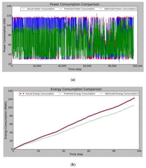 Figure 8a shows the power consumption comparison in all weathers or in a whole year. The red, blue, and green lines indicate the actual, predicted, and optimized power consumption, respectively. From the figure, the overall optimized power consumption is below the actual and predicted power consumption. Figure 8b shows the energy consumption comparison in a year. The red dot indicates the actual energy consumption, blue line indicates the predicted energy consumption, and the green line indicates the optimized energy consumption. From the figure, the overall optimized energy consumption is below the actual and predicted energy consumption. The distance difference between the green and blue lines represents that energy-saving in the long term is increasing gradually.