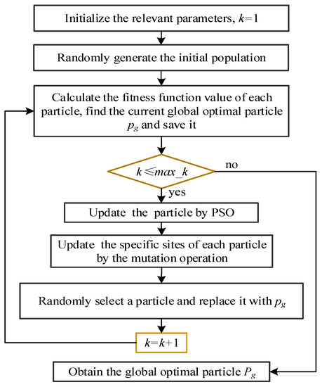 In this study, a GA–PSO hybrid algorithm was proposed by combining PSO and the GA mutation operation. After the completion of the PSO iteration in each generation, the current global optimal particle was found and saved. The mutation operation was conducted at specific sites for each particle. This step can increase the population richness of the particle swarm such that the algorithm maintains a strong local search ability in later iterations. After the mutation operation, a particle is randomly selected from the new population and replaced with the previously saved global optimal particle to ensure that the global optimal particle enters the next iteration of the algorithm, which improves the convergence speed and searchability of the algorithm. As an integrated algorithm, PSO–GA combines the merits of GA and PSO but avoids their drawbacks. In addition, PSO–GA has stronger efficient optimization capability than GA or PSO alone [67]. The GA–PSO hybrid algorithm flowchart is shown in Figure 2. More details can be found in reference [68].
