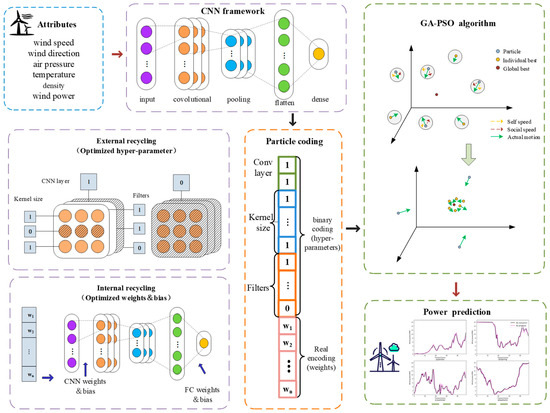 In summary, CNN has been widely used in complex wind power forecasting. Integrating the intelligent algorithm GA-PSO into CNN provides a feasible idea for determining the CNN network structure (such as the number of convolution layers, the size, and the number of convolution kernels, etc.) or the training connection weights (weights and biases). However, most existing research only focuses on optimizing network connection weights, and the network structure parameters are still subjectively determined. Thus, to further improve ultra-short-term wind power prediction accuracy and address the shortcomings of traditional CNN prediction models in which the hyperparameters are subjectively difficult to determine and likely to fall into a local optimum, a hybrid GA–PSO–CNN model based on a mix-encoding GA–PSO algorithm is proposed in this study for ultra-short-term wind power prediction. The model uses related wind farm influencing factors as inputs (wind speed, wind direction, temperature, etc.), conducts hybrid coding design for relevant parameters of the CNN, and uses a GA–PSO hybrid algorithm to synergistically optimize the hyperparameters and connection weights in the CNN, which solves the problem of subjective determination of the optimal network in the CNN and effectively prevents local optimization in the training process. By doing so, this paper makes novel contributions on two aspects: on the one hand, the GA-PSO hybrid algorithm in the proposed model realizes the automatic optimization of hyperparameters in CNN. The model can effectively determine the optimal hyperparameters combination, avoiding tedious and inefficient manual tuning. On the other hand, in the CNN training process, the global search capability of PSO is combined with the fast convergence of the BP algorithm to prevent the model from falling into a local optimum during the training process, which further improves the performance of the prediction model.