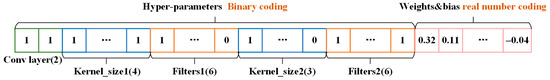 A specific coding example of the parameters in the GA–PSO–CNN model is shown in Figure 4. The hyperparameter value was obtained by summing the binary values controlling all positions of the parameter.