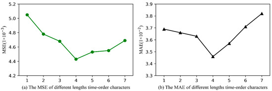 Error curve of time-order characters with different lengths. (a,b) are the MSE and MAE of different lengths time-order characters, respectively.