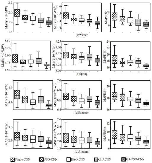To further verify the performance of the proposed model, each model was compared with GA–PSO–CNN, using MAE, MSE, and MAPE to measure its prediction accuracy. To ensure the validity of the evaluation criteria, the input of all models in the experiment was the same. As the experimental results have a certain degree of randomness, each model was trained 50 times to prevent accidental results in a single operation. The average of the error indicators for 50 operations was calculated for comparison to ensure the fairness of the results. Figure 8 shows the distribution of each performance index obtained from 50 independent operations of each model. It was observed that in each season, the GA–PSO–CNN model had a higher prediction accuracy and a smaller fluctuation interval in each performance index than the comparison models, which verified the excellent prediction performance and robustness of this model.