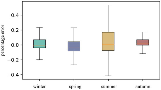 Due to the large climatic differences in different seasons, 3 days were randomly selected from different seasons to draw the error box plot between the predicted power of the GA–PSO–CNN model and the actual wind power, as shown in Figure 9. It was observed that in autumn and winter, the uncertainty of wind power prediction was relatively low; the error between the predicted value and the actual value was generally maintained below 10%. However, the uncertainty of wind power forecasting was greater in summer; the error was controlled within 20%. The climate conditions in summer were more complex and rainy and were not conducive to wind power prediction.