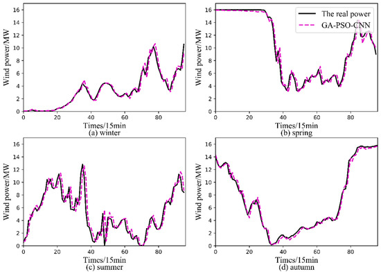 The GA–PSO–CNN model can accurately predict wind power in different seasons, time periods, weather, and other conditions. Compared with other models, the GA–PSO–CNN model has improved prediction accuracy and robustness. This model can be applied to ultra-short-term wind power prediction in different scenarios.