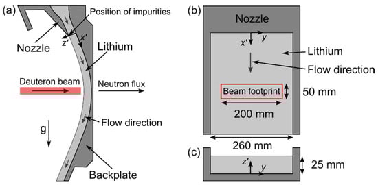 Sketch of the liquid lithium target in DONES. (a) Side view on the cross-section through the channel center. (b) Front view. (c) Cross-section perpendicular to the flow direction at the nozzle outlet. The coordinate axes are y for the channel width, x′ parallel to the channel floor in streamwise direction and z’ perpendicular to the channel floor. The origin is at the nozzle outlet.