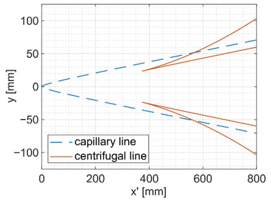 The solution of Equations (1) and (2) for n = 1, u = 15 m/s in lithium without the assumption of a dominant force is shown in Figure 2. The blue dashed line in the diagram represents the capillary wake line dominated by the surface tension and the red lines are the centrifugal wake dominated by centrifugal forces. Considering the analytical solutions, it was concluded that wakes from the nozzle corners do not reach the beam footprint [3] and, thus, the accumulation of impurities at the nozzle edge are the main source for a film thickness decrease. For the prediction of the wake shape, the solution for n = 0.5 was used, which describes the position of a wave crest and was compared to the experimental results.