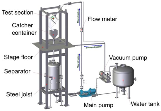 The experiments were conducted at the water flow test facility FIDES at KIT (Karlsruhe Institute of Technology). The general layout of the facility is shown in Figure 3. A pump provided a constant water mass flow to the top end of the test section, which was measured using a magnetic inductive flow meter. The test section made of plexiglass was geometrically similar to the layout of the liquid lithium target in DONES, as depicted in Figure 4. The water in the test section flowed through a flow straightener into a two-stage nozzle with an outlet cross-section of 100 × 10 mm. A maximum flow velocity at the nozzle outlet of u = 20 m/s could be reached. Downstream of the nozzle, water flowed through the concave open channel with a curvature radius of R = 250 mm before it returned to the separator.